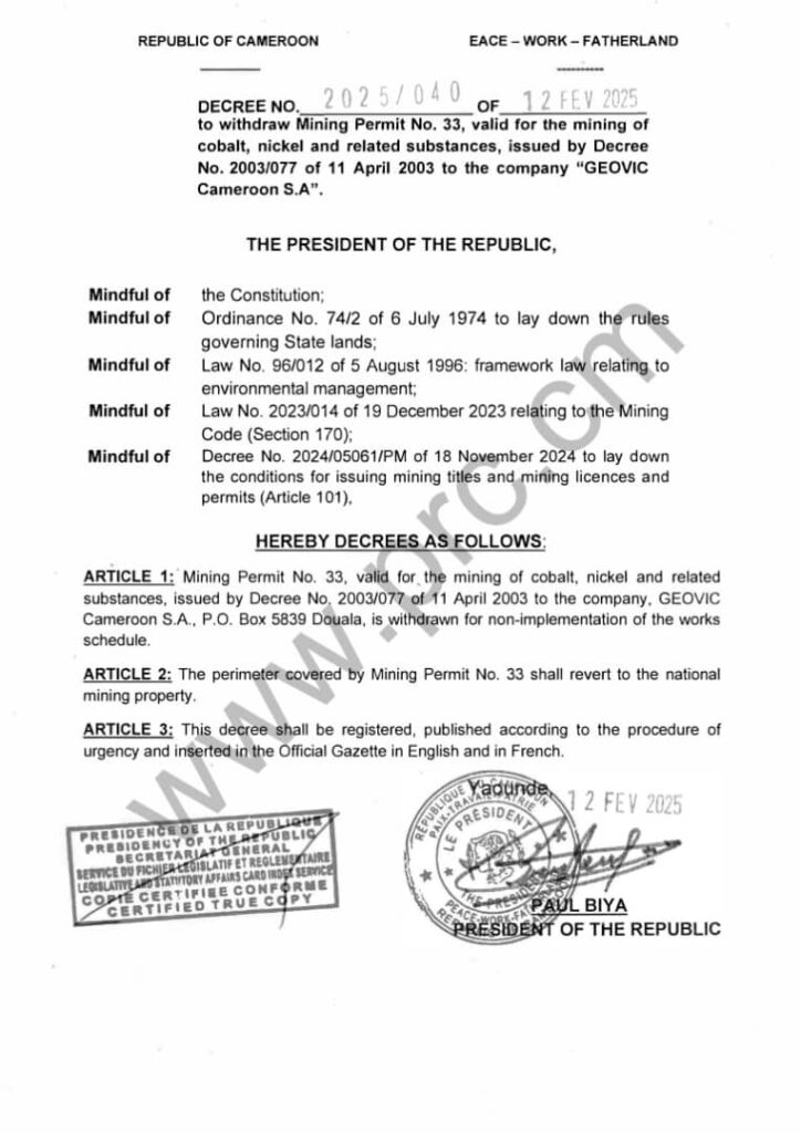 Presidential Decree N°2025/040 of 12 February 2025 orders the revocation of Mining Permit N°33, initially granted to GEOVIC CAMEROON S.A., covering the extraction of cobalt, nickel, and related substances, pursuant to Decree N°2003/077 of 11 April 2003.