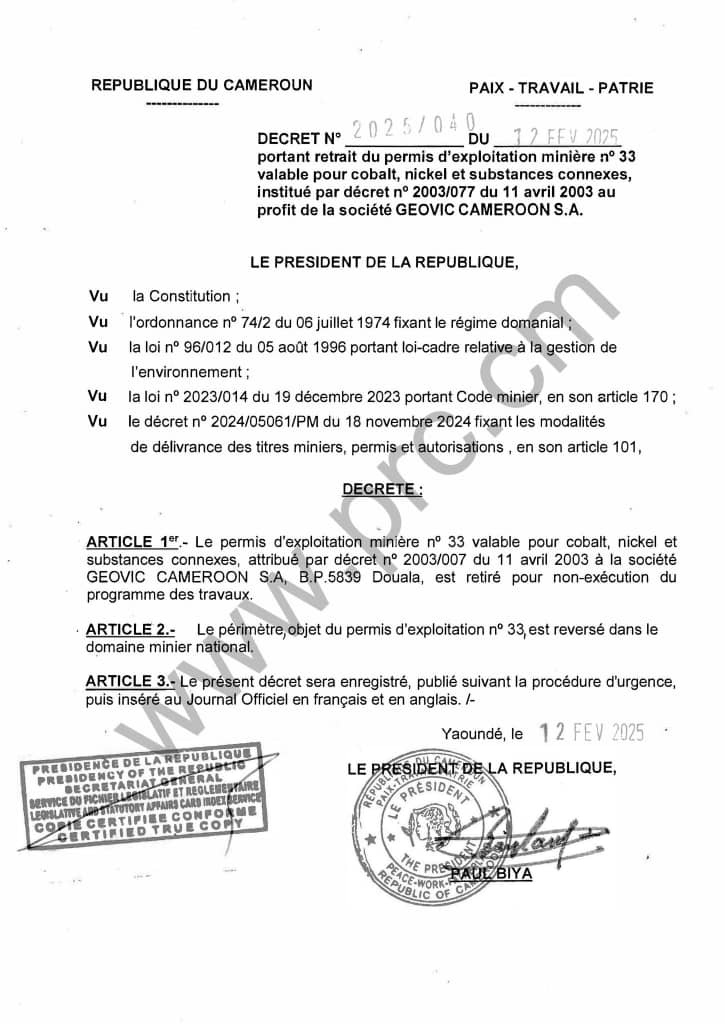 Le décret présidentiel n°2025/040 du 12 février 2025 prononce le retrait du Permis Minier n°33, initialement attribué à GEOVIC CAMEROON S.A., couvrant l’extraction du cobalt, du nickel et substances connexes, conformément au décret n°2003/077 du 11 avril 2003.
